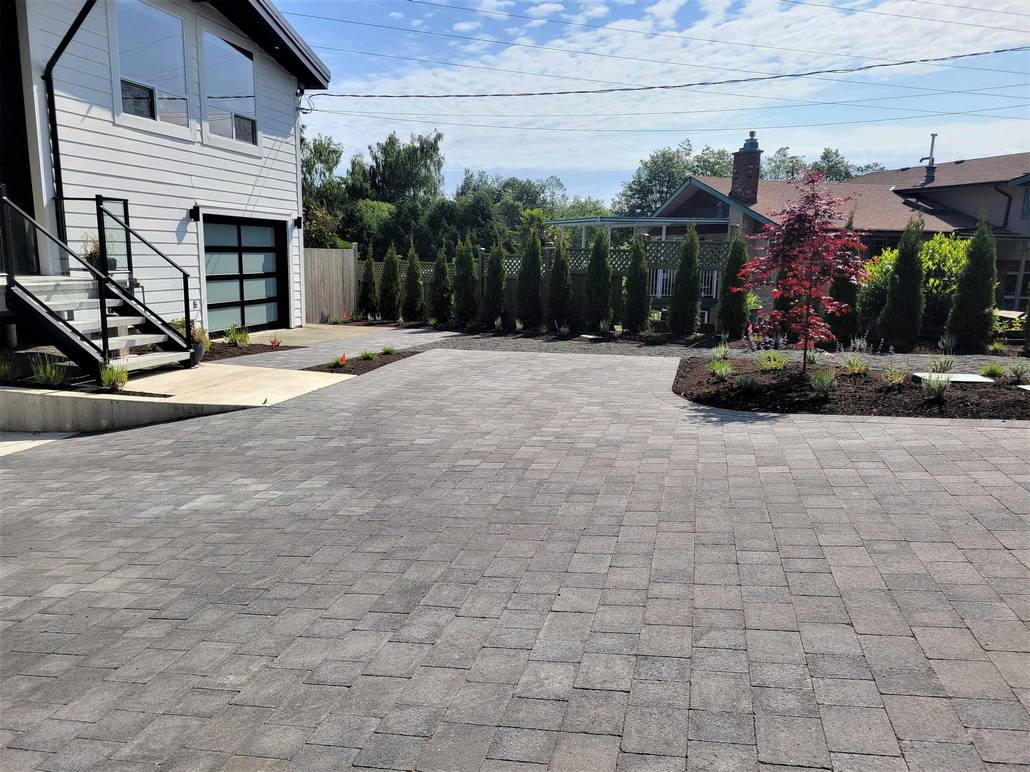 This south Oak Bay heritage house already had a red concrete paver walkway to the front door. We kept that theme with a new driveway and back patio. The lumber in the chunky cedar pergola over the back patio was dipped in Lifetime Wood Treatment. The homeowners have dreams of putting an outdoor kitchen in back there!